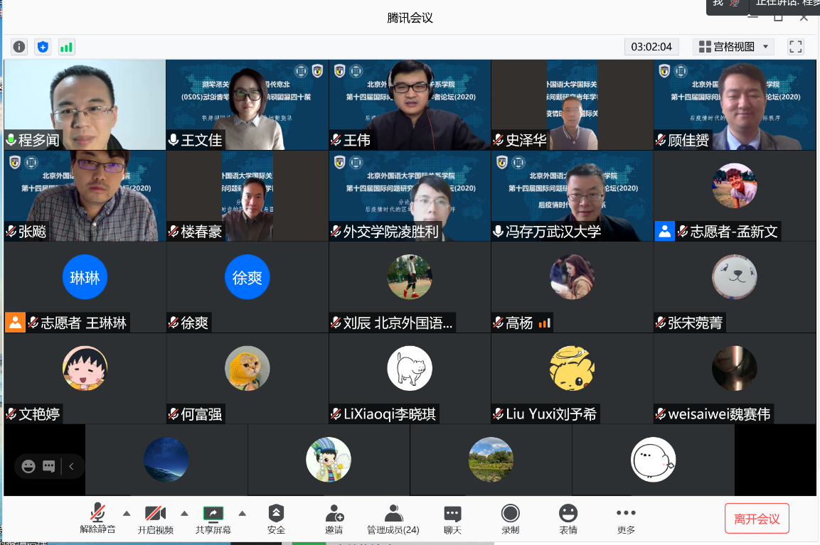本次青年学者论坛共设四个分论坛,分论坛一主题为“后疫情时代的中国对外关系”,由北外国关学院的郭凤林老师主持。学者们围绕后疫情时代的中美关系与大国博弈、中国与东南亚安全关系、中国与南欧五国关系、中缅命运共同体建设、中国对非援助新模式、中国“一带一路”建设高质量发展新路、中国民间外交与国家形象提升等问题展开深入讨论,北外国关张颖教授、杨毅教授分别对发言进行了精彩的点评。