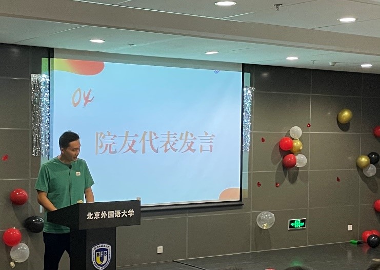 最后,学院党总支书记张效民老师总结致辞,他再次表示欢迎校友回家,随后,他列举一些在北外学习生活时的动人的场景,使校友们对于国关的回忆变得更加鲜活与具体。他指出院友们在各自岗位上兢兢业业工作,为学院赢得了良好声誉,是学院为宝贵的财富。他同时也希望全体国关人都拥有知周中外道济天下的情怀和境界,为国家发展民族复兴做出更大贡献。