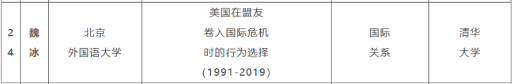 其中,我院教师魏冰的博士论文《美国在盟友卷入国际危机时的行为选择(1991-2019)》成功入选。魏冰于2024年6月在清华大学获得博士学位,入职北外国关一年多以来,已发表五篇高质量学术论文。