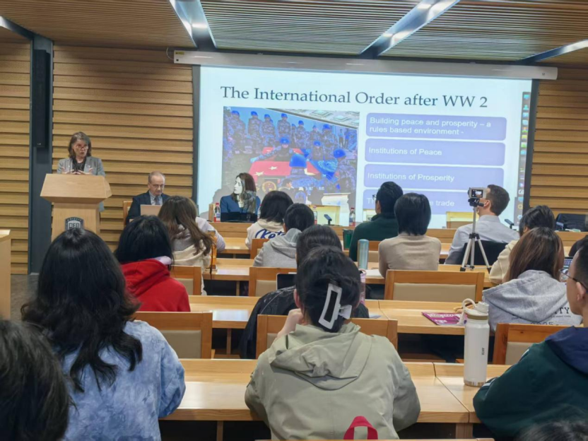 2025年10月17日上午,基尔大学副校长唐娜·李(Donna Lee)教授、基尔大学教育学院院长丹尼尔·赫伯特(Daniel Herbert)教授以及基尔大学国际化与合作事务院长克里斯汀·布里尔(Kristen Brill)博士在北外举办了题为“特朗普对国际秩序的影响(The impact of Trump on the international order)的专题讲座。本次活动由太阳成集团tyc41183院长谢韬教授主持,北外—基尔外交学合作办学项目2025级新生、项目外教以及太阳成集团tyc41183的教师参加。