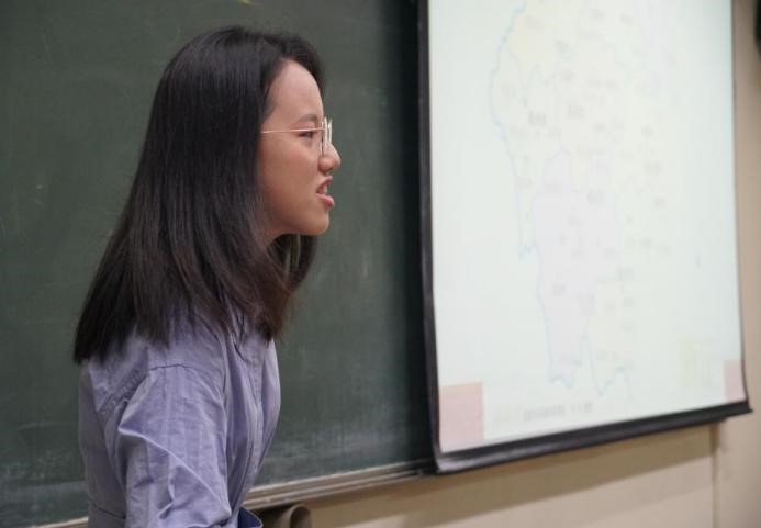 本次宣讲活动由两个专题组成,分别由两位本科同学进行宣讲。首先由16级外交学专业的吴雯萱同学讲述二十年来发生在她的家乡——浙江温州市平阳县昆阳镇的变迁故事。从家乡的山水入手,她介绍了“河长制”的出现为环境带来的变化,以及家乡交通建设的发展,生动地描绘了家乡新面貌。最后,吴雯萱同学希望在座的同学能够关注身边的点滴变化,感受祖国的蓬勃发展。