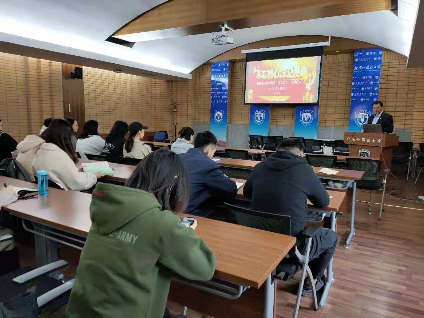 张效民书记以“加强党员队伍建设,为党育才,为国育人”为主题讲授专题党课。他首先带领大家学习了习近平总书记关于教育的系列论述,强调教育是党之大计、国之大计,立德树人是教育的根本。学生党员是学生中的骨干,加强党员队伍建设、提高党组织的凝聚力、创造力、战斗力,对于实现教育目标关系重大。张效民老师随后详细分析了对国关学生党支部工作的调研结果,指出广大学生党员对于支部的工作整体上是非常满意的,对于发展党员的程序和标准也给与了积极的肯定。但同时也存在一些问题,如有些学生对入党流程不了解、有些党员组织纪律不强,缺少党员意识等等。他提出今后支部应加强积极分子和预备党员的考察培养、加强资料管理、严肃组织纪律、进一步强化制度建设等。