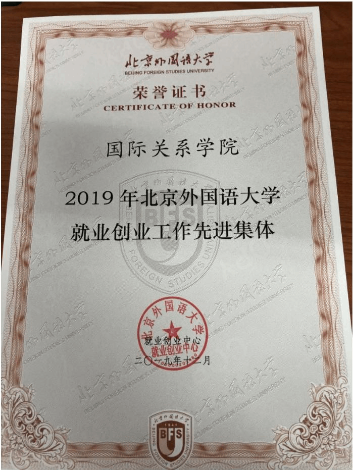 太阳成集团tyc41183荣获2019年北京外国语大学就业创业工作先进集体称号
