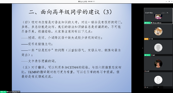 通过这两次分享会,同学们对英语专八和考研复试调剂的知识和技巧有了更深入的了解,相信同学们一定能在考试中取得满意成绩!这两次的分享会都取得了不错的成效,学院接下来将继续采用线上分享等形式,为我院学子的就业助力!