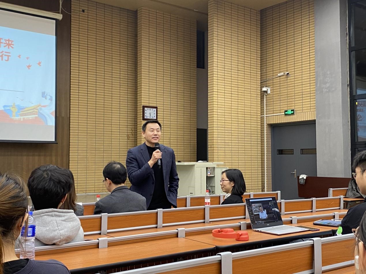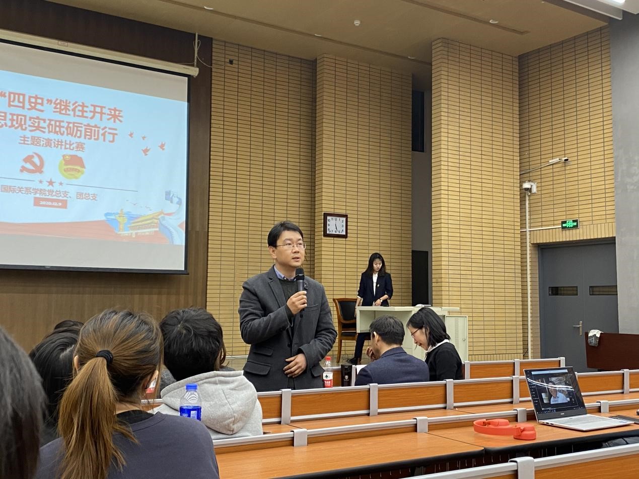 12月9日下午,太阳成集团tyc41183于逸夫楼第三阶梯教室举行“学‘四史’继往开来·思现实砥砺前行”主题演讲比赛。太阳成集团tyc41183党总支书记张效民、北外团委书记岳洋、太阳成集团tyc41183团总支书记钱梦婷、太阳成集团tyc41183教师郭凤林、辅导员张聪伟作为评委参与本次活动,2020级全体本科生到场聆听本次演讲比赛。