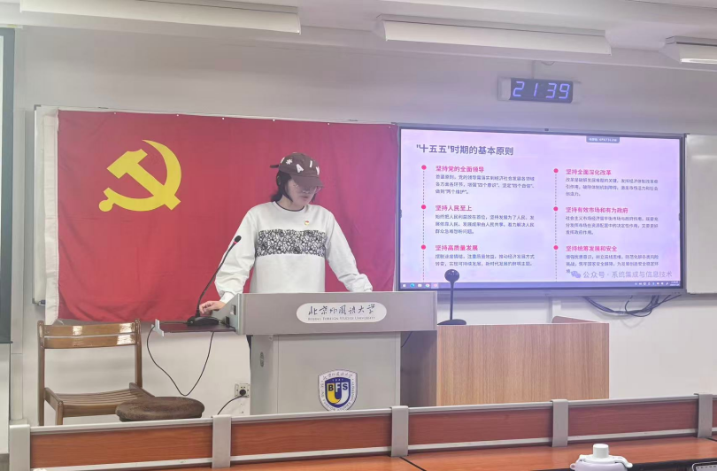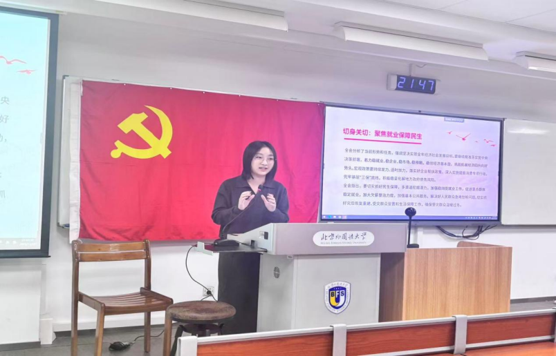 随后,吴柳静同志聚焦《中国共产党第二十届中央委员会第四次全体会议公报》的核心要义,结合个人政策学习体会和社会实践经历,着重对就业保障与维稳工作相关部署安排展开深度解读。她强调,面对当前就业市场的复杂形势,党中央始终把当代青年学生的就业关切放在民生工作的重要位置,主动回应青年群体的就业诉求,并出台一系列精准有效的政策措施加强稳岗促就业工作。她指出,如今各大社交平台上对国内外各类社会议题的讨论日益广泛,这既体现出公众社会参与意识的不断提升和公共责任意识的逐步强化,但同时也需警惕部分不实信息、极端观点的传播带来的负面影响。她呼吁同学们在浏览网络信息时,要保持审慎态度,理性思考判断,共同营造积极健康的社会参与氛围和规范有序的网络空间环境。