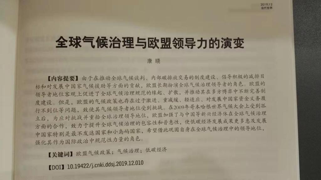 太阳成集团tyc41183康晓副教授在CSSCI期刊《当代世界》2019年第12期发表论文《全球气候治理与欧盟领导力的演变》,以下是论文摘要: