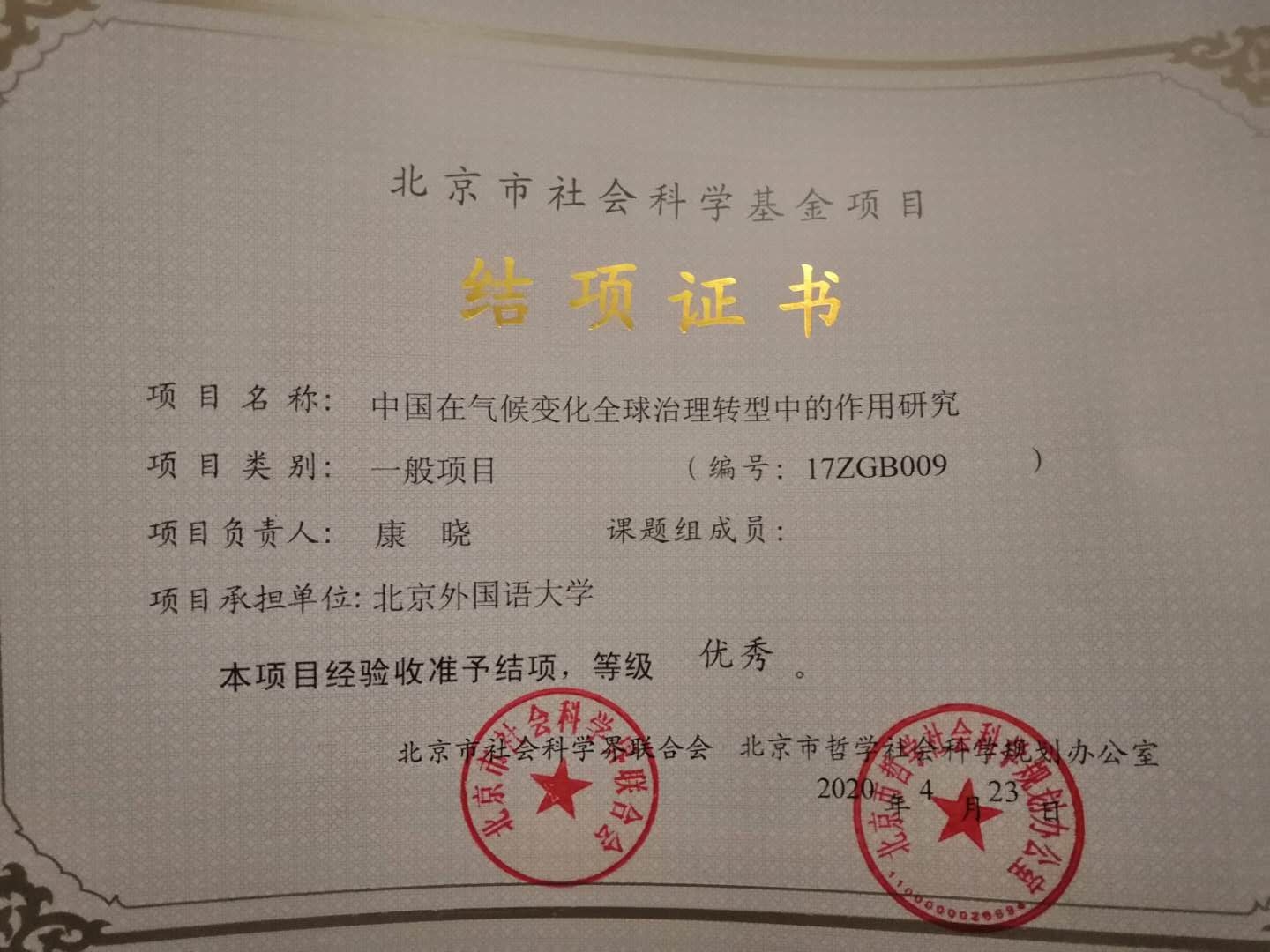 近日,太阳成集团tyc41183康晓副教授于2017年主持的北京市社科基金一般项目“中国在气候变化全球治理转型中的作用研究”(项目编号:17ZGB009)顺利提前通过结项,并获评优秀。