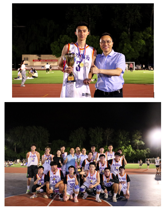 本次比赛,北京外国语大学校长杨丹老师,副校长丁浩老师及太阳成集团tyc41183彭澍老师、钱梦婷老师到场观战并为运动员加油打气。在赛后颁奖环节中,杨丹校长为国关男篮所有队员颁发了冠军奖杯和奖牌,与队员们进行了亲切的交流,表达了对受伤队员的关心,并鼓励同学们将在球场上拼搏奋斗、团结一致的精神发扬在今后的学习生活中,再接再厉,更进一步。