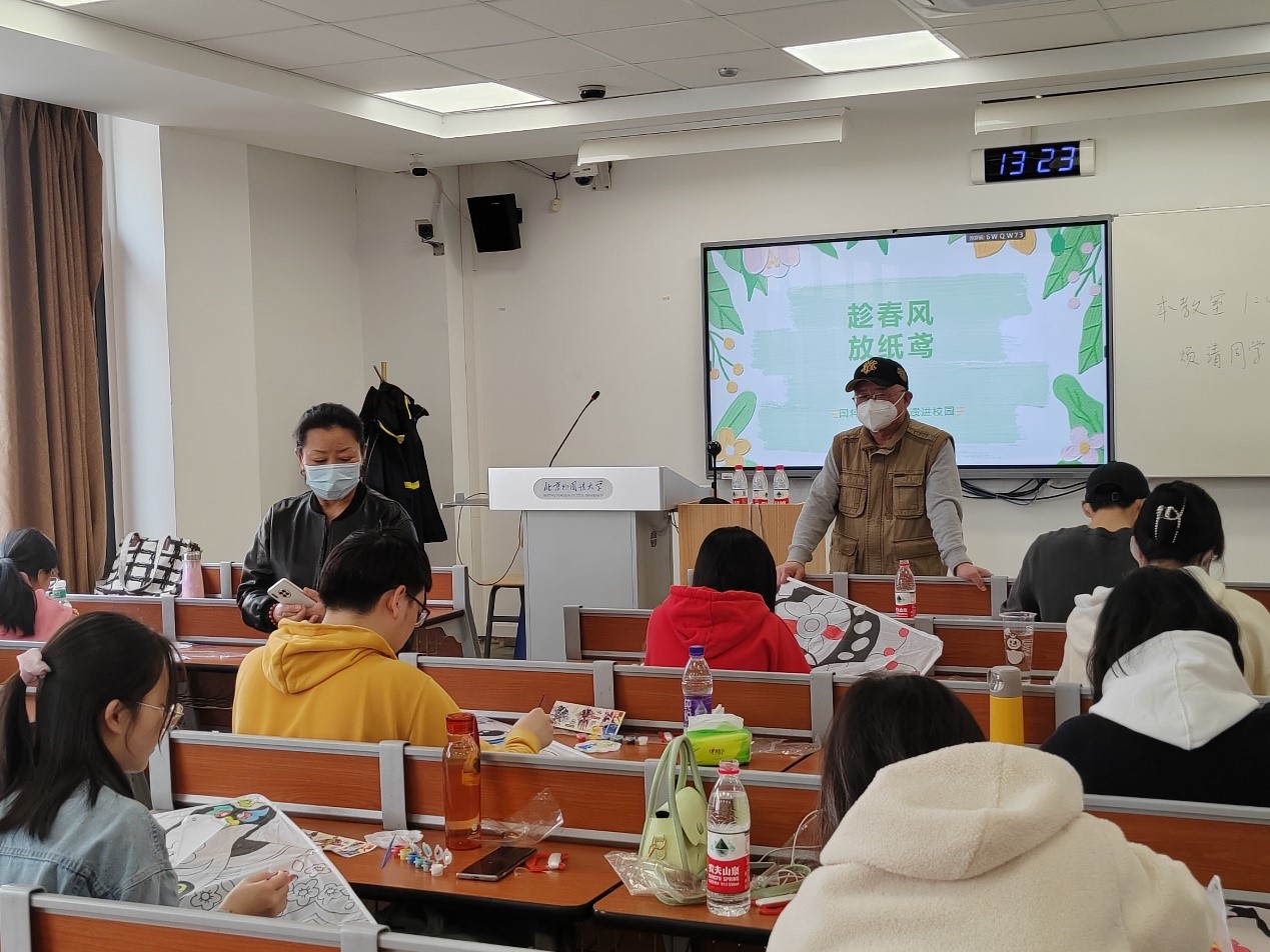 本次活动于3月22日下午2点在逸夫楼505举办,邀请了国家级社会体育指导员、北京市风筝协会理事赵冠璞老师、刘佩静老师现场指导。老师们首先为同学们讲解了风筝的历史和起源。“风筝”源于东周春秋时期,至今已有两千多年的历史,相传墨翟以木头制成木鸟,研制三年而成,这便是人类最早的风筝。后来鲁班用竹子改进风筝材质,东汉蔡伦改进造纸术后,坊间开始用纸做风筝,一直到宋代,放风筝已成为人们非常喜爱的户外活动之一。老师还向同学们现场展示了“扎、糊、绘、放”等传统制作工艺,并向同学们介绍了各地举办风筝赛事的情况。通过老师的讲解,同学们不仅了解了风筝的历史,而且近距离欣赏与感受了风筝艺术的魅力。