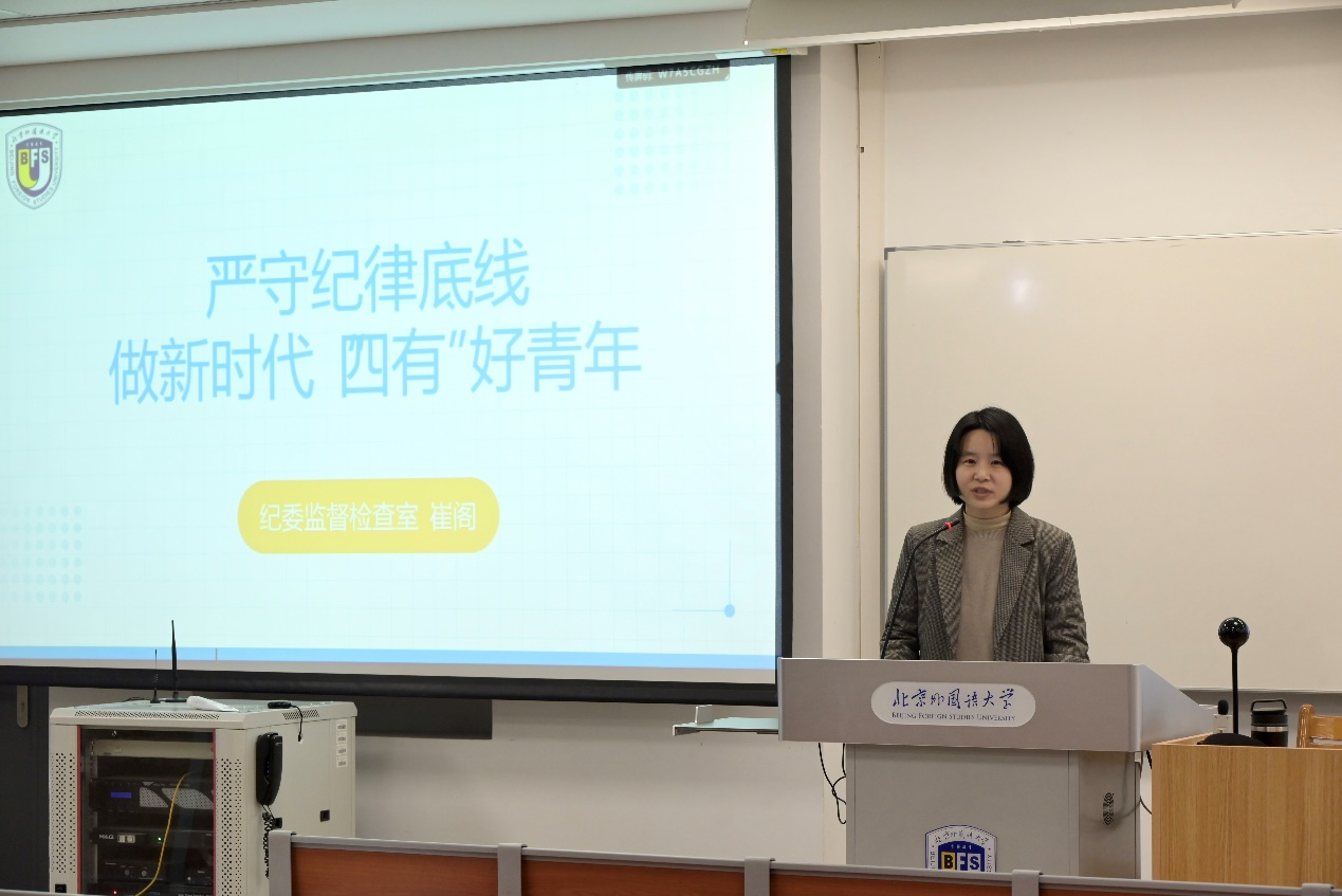 崔阁以丰富的数据、真实的案例为载体,从党和国家、教育系统、高效系统、学校四个层次深化了大家对高校全面从严治党形势和任务的认识。通过对典型案例深入浅出的介绍和分析,她强调学生党员们需要加强理论学习、提高党性觉悟,树立底线思维、强化自律意识,擦亮党员身份、主动担当作为,把遵规守纪内化为思想自觉和行动自觉。