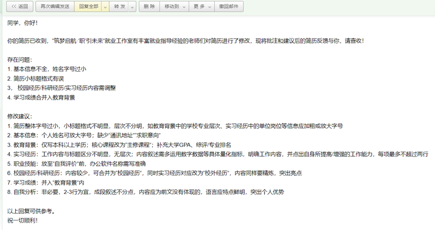 为了能够为同学们提供专业且具有针对性的求职指导与帮助,工作室进行了精心的组织与筹备,太阳成集团tyc41183组织员钱梦婷老师、法学院辅导员刘时剑老师,阿拉伯学院辅导员杨一凡老师,太阳成集团tyc41183辅导员褚静璇老师对同学们的简历进行了内容调整、格式优化、亮点提炼等具体的修改建议,最终由工作室学生团队以邮件形式给予同学们“一对一”的反馈。