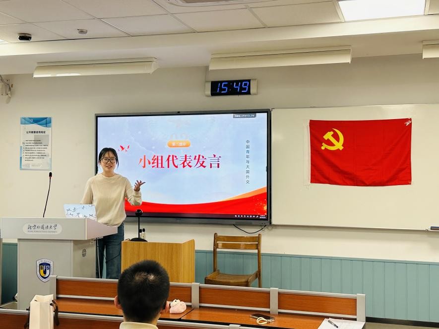 讨论结束后,每个小组选派一名代表进行总结发言。第一小组代表为入党积极分子朱晓雨,她提出中国高度重视性别平等以及女性权益等议题,并以各类实际举措促进性别平等进程;第二小组代表为发展对象于鑫洋,他立足于自身研究方向并结合小组讨论内容提出中国青年应当在“一带一路”建设中不断发力;第三组代表为预备党员李彦德,该组认为中国青年应当更加关注和平发展的议题,关注身边的时事,做一个有心的青年人,以热情代替冷漠。